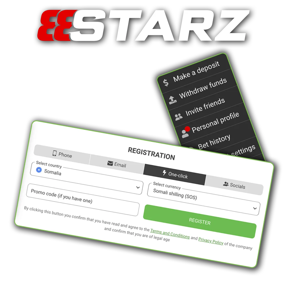 Account creation is also available in the 888starz application for players in Somalia. The same methods can be used, including phone number, e-mail, one-click, and social networks. The sequence of steps matches the website process, so all actions follow the same order. After registration, access opens to sports betting, casino games, and available bonuses in SOS.